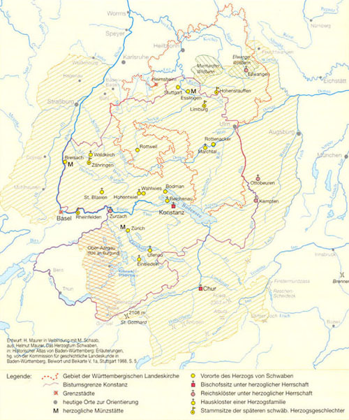 Das alte Herzogtum Schwaben umfasste außer dem Süden Baden- Württembergs auch Teile der Schweiz, das Elsaß, das bayrische Schwaben und Vorarlberg. Nach der Zerschlagung des alemannischen Herzogtums 746 und der Eingliederung der Alemannen in das Frankenreich wird ein Herzogtum Schwaben 916/917 gegründet und es besteht bis 1268. Erster Herzog von Schwaben ist Burkhard I. Die Anfänge werden von Mord und Intrigen überschattet und behindert. Die Herzogwürde geht später in den Besitz der Staufer und erlischt 1268 mit dem Tod des letzten Staufers. |